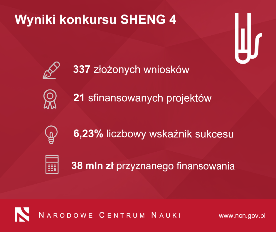 Międzynarodowy, dwustronny konkurs SHENG 4 na polsko-chińskie projekty badawcze jest organizowany przez Narodowe Centrum Nauki wspólnie z chińską agencją National Natural Science Foundation of China (NSFC), zgodnie z procedurą oceny równoległej. Oznacza to, że obie agencje prowadzą równoległą ocenę formalną i merytoryczną wniosków, a finansowanie otrzymają tylko te projekty, które uzyskają jednocześnie rekomendację NCN i NSFC. W konkursie SHENG 3 można było składać wnioski obejmujące badania podstawowe w wybranych obszarach dyscyplin objętych panelami HS6_01-HS6_08, HS6_14-HS6_15, ST4, ST5, ST8 i ST1 oraz NZ1-NZ9.