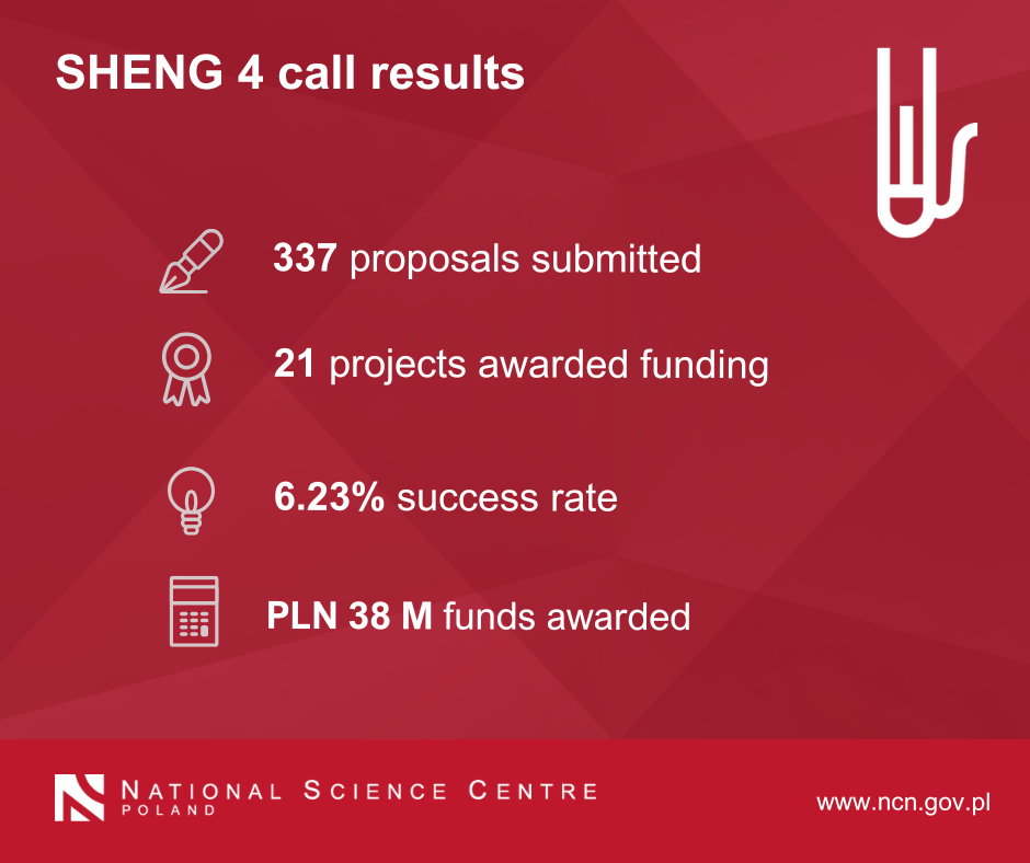 Under SHENG 4 that has just been concluded, researchers could submit proposals to selected disciplines within three research domains. Out of 337 proposals, 229 were submitted to Physical Sciences and Engineering, 103 to Life Sciences, and only 5 to Humanities, Social Sciences and Art Sciences. Nearly PLN 22.5 million was awarded to 13 projects in Physical Sciences and Engineering and nearly PLN 16 million to 8 projects in Life Sciences. The success rate was 6.23%.