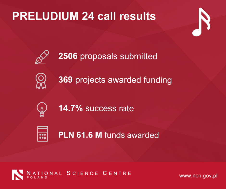 In PRELUDIUM 24, 2,506 proposals were submitted; 758 were evaluated in the second stage, and ultimately 369 proposals were recommended for funding, with a total value exceeding PLN 61.6 million. The success rate was 14.72%.