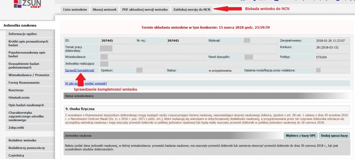 Po wypełnieniu poszczególnych zakładek wniosku i sprawdzeniu jego kompletności wniosek należy zablokować poprzez kliknięcie przycisku Zablokuj wersję wniosku do NCN. Wówczas w pasku po lewej stronie pojawi się zakładka: Elektroniczna wysyłka wniosku.