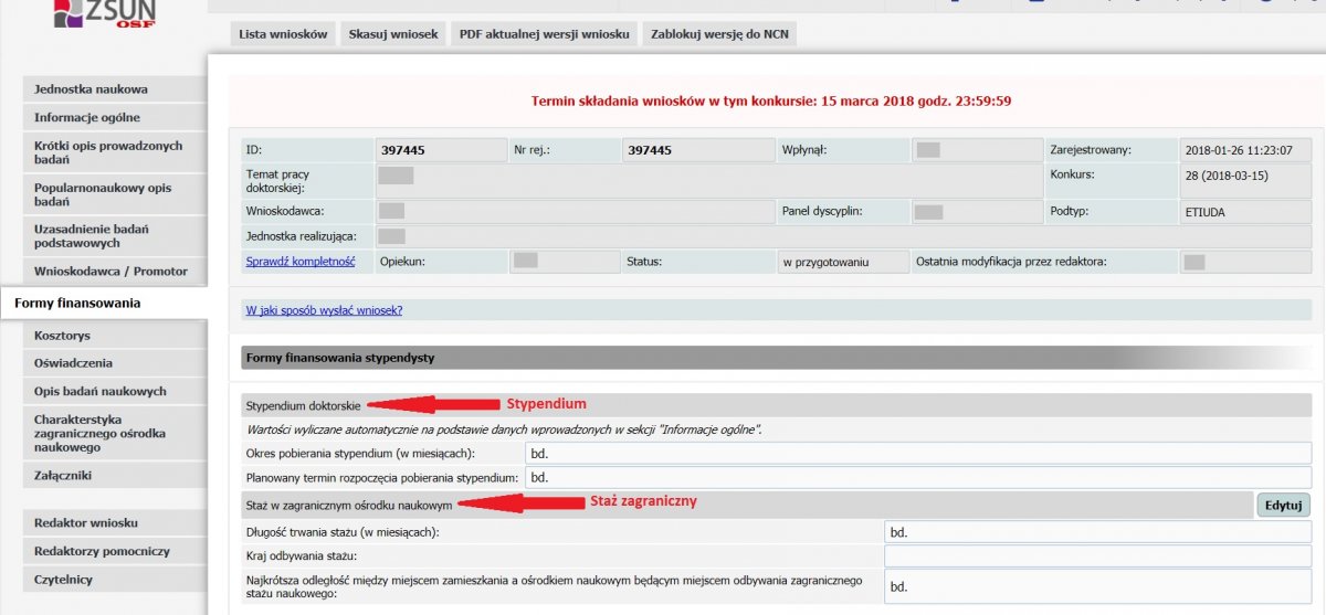Zarówno ci wnioskodawcy, którzy w dniu składania wniosków mają wszczęty przewód doktorski jak również osoby, które zobowiązują się wszcząć przewód doktorski do dnia 30 czerwca 2018 r. deklarują uzyskanie stopnia naukowego doktora w terminie do 12 miesięcy po zakończeniu pobierania stypendium. System OSF automatycznie wylicza datę w zależności od czasu pobierania stypendium.