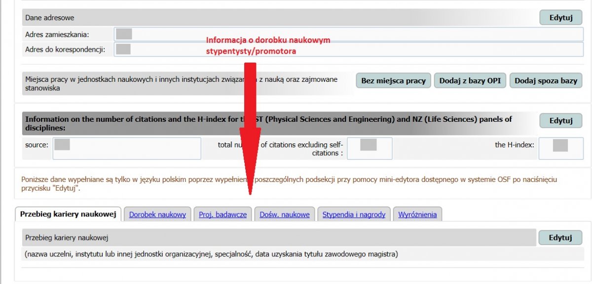 - Zakładka Dorobek naukowy: Tutaj wnioskodawca wymienia wszystkie publikacje, w tym publikacje w renomowanych czasopismach lub wydawnictwach naukowych (podać należy następujące informacje: miejsce i data publikacji, aktualny pięcioletni „impact factor” czasopism i liczbę cytowani poszczególnych publikacji, łączną liczbę cytowań wszystkich dotychczasowych publikacji bez autocytowań – preferowane źródło – Web of Science TMCore Collection lub Scopus).
